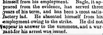 The Evening Herald of Wednesday June 21, 1893 carried a story about the strike. Timothy, then a master tailor, ‘whose employees are locked out’ had taken a prosecution at the Police Court against his indentured apprentice.