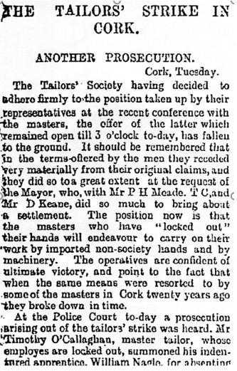 There are no further newspaper articles on this story so it is not possible to say whether or not Timothy’s desire to have his apprentice see out his ‘indentures’ was achieved. There is no William or Cornelius NAGLE, tailor, in Cork in the 1901 census. Could this strike and prosecution have resulted in him losing his trade?