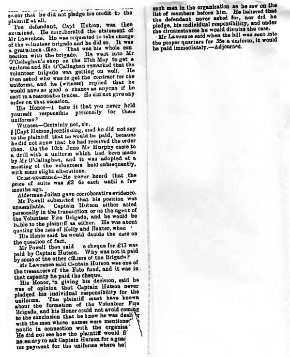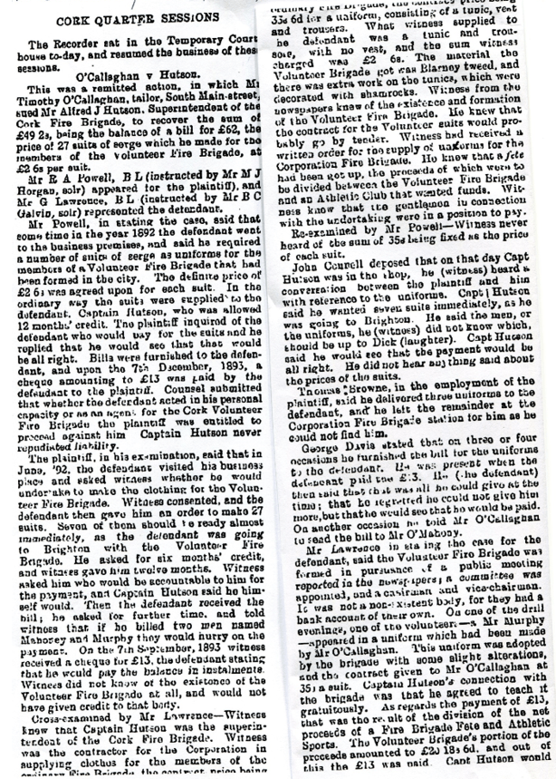 At the Quarter Sessions, yesterday, a remitted action, in which Mr Timothy O’Callaghan, tailor, South Main street, Cork, sued Captain Hutson, Superintendent of the Cork Fire Brigade, for £49 2s, balance alleged to be due on 27 uniforms obtained for the members of the Volunteer Fire Brigade, was dismissed.