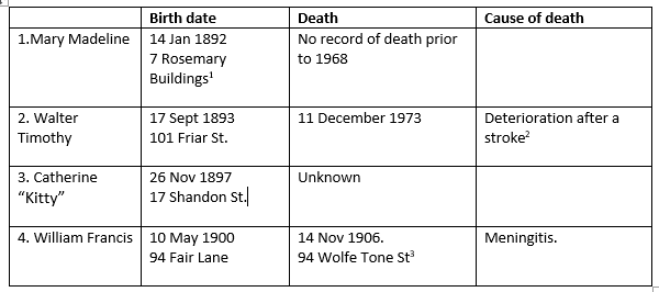 “Babe’’s first child, known as Madeline, was born when James was still working as a policeman in Limerick City. At the time of their marriage James would have been required to transfer out of Cork city, so as not to work in the county of his wife’s family.