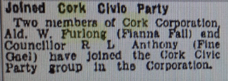 After years as an active member of Fianna Fáil, Walter joined the Cork Civic Party in 1954. The Civic Party was a pro-business political party, active 1945 to 1966.