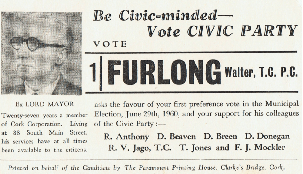 In 1960 Walter, finally exiting the Corporation, was acknowledged by the outgoing Lord Mayor, Senator Jane Dowdall, Cork’s first female Lord Mayor.