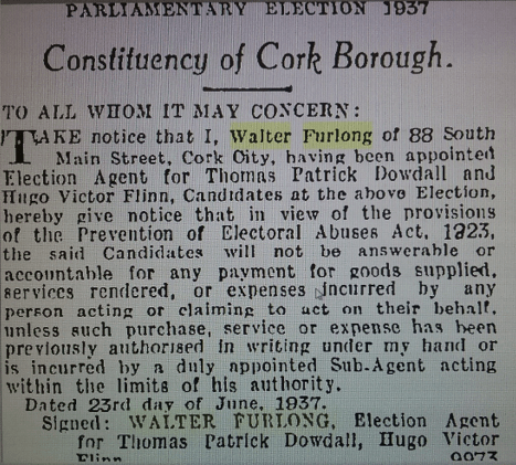 The following advertisement in the Irish Examiner, Thursday, June 24th, 1937 was replicated for the 1938 Parliamentary election in the Irish Examiner Wednesday June 08, 1938.