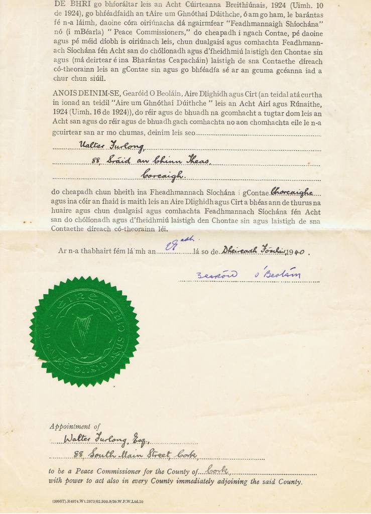 Walter was appointed Peace Commissioner in 1940, announced in the Weekly Irish Times of 16 November 1940. A Peace Commissioner is known as a Justice of the Peace in other countries.