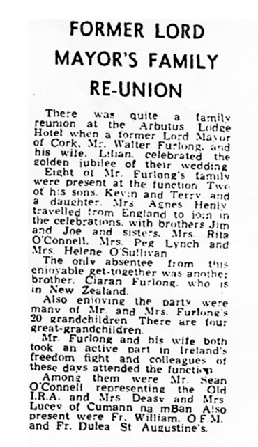 In 1966 the Furlongs celebrated their golden wedding Anniversary. This made the Irish Examiner on Thursday Sept 22nd. (Helena’s name is reported as Lilian.)