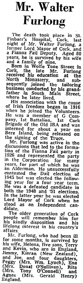 The Cork Examiner of Wednesday December 12,1973 had a photograph of Walter on its front page and the text: Mr. Walter Furlong, a former Lord Mayor of Cork, who died last night (see obituary on page 9).