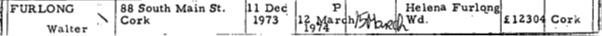 Furlong (Cork) – On Dec 11 1973 at St. Finbarr’s Hospital, Walter Furlong, P.C. (T.O.S.F), Liberty St, beloved husband of Helena, 89 South Main St. (late Irish Volunteers, 1916, & ‘G’ Coy 1st Batt, 1st Cork Brigade, Old I.R.A.) Deeply regretted by his loving wife, family, sons-in-law, daughters-in-law, grandchildren & great- grandchildren. Requiem mass Ss. Peter & Paul’s Church to St. Joseph’s Cemetery.