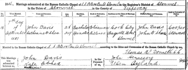 John served in Clonmel where he met his wife, Catherine O’SHEA. They married 7 Sept 1881, with John having already been transferred to County Cork away from his wife’s county.