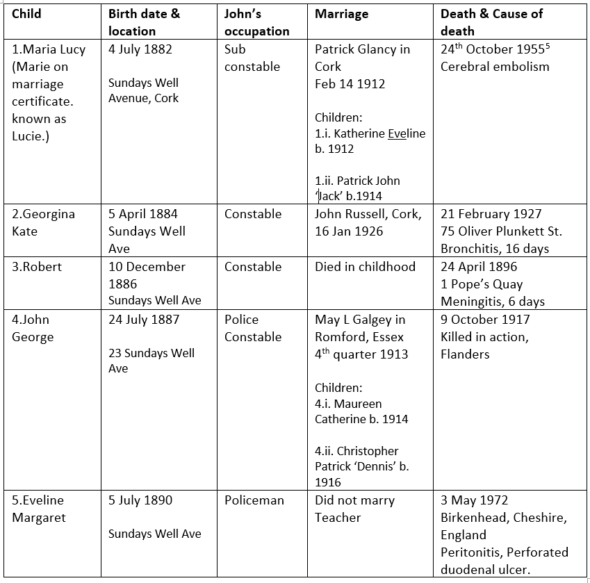 John was ex-directory. Was this due to his R.I.C. background? (Brother George, who did not reach the same rank as older brother John, did appear in the various Cork street directories over the years.)