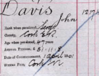John’s annual pension was £51 / 11 /8, paid in quarterly sums of 12 /17/ 11. He was by then long settled in Cork city.
