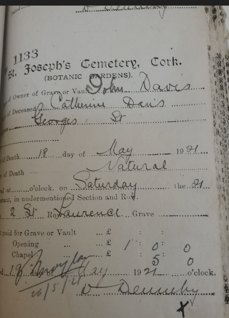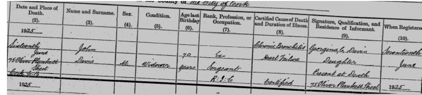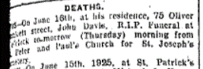 Kate (O’Shea) DAVIS predeceased her husband, dying 19th May 1921 from a cerebral haemorrhage. They were living at 75 Old George’s Street, now known as Oliver Plunket Street.