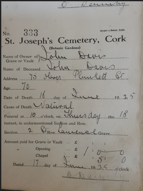 John’s death notice, in the Irish Examiner on June 17th, was exceptionally brief. His funeral was at St Peter and Paul’s and he was buried at St Joseph’s cemetery on 18 June.