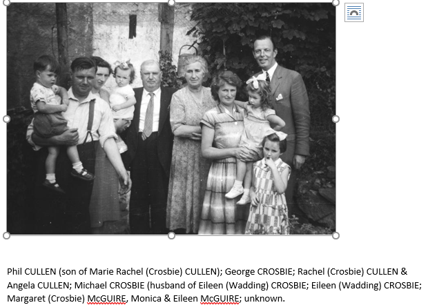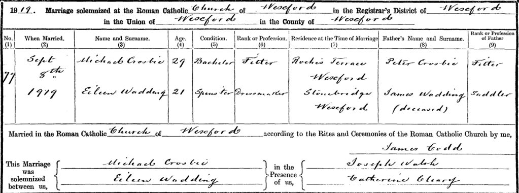 Margaret (Davis) and James WADDEN/WADDING’s youngest daughter Eileen (b. 13 Feb 1898) married Michael CROSBIE in 1919.