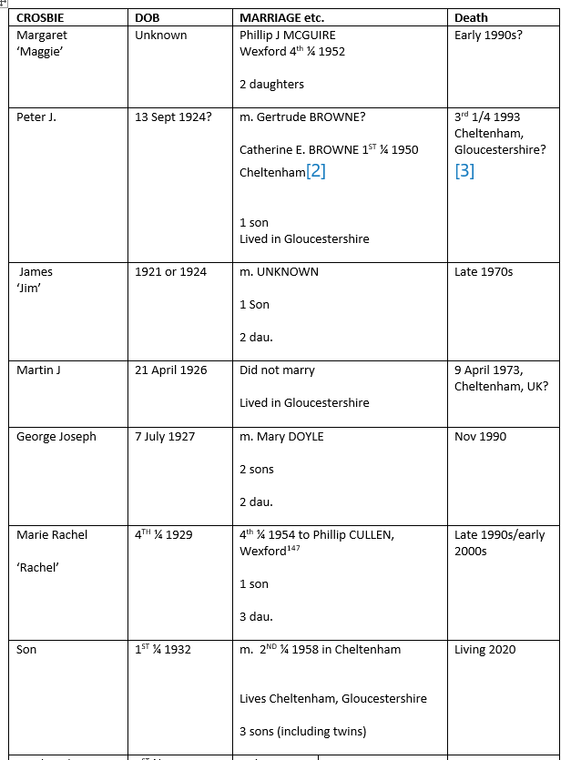 Michael CROSBIE died in 1966. According to his death record the Crosbies had lived at Trinity St, Wexford and Michael was then a retired factory foreman. He had been a union official. Eileen reportedly died 6 June 1971. [5].