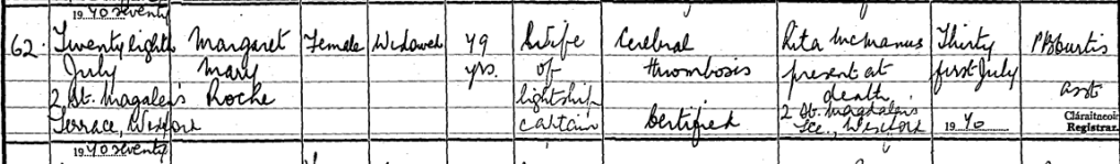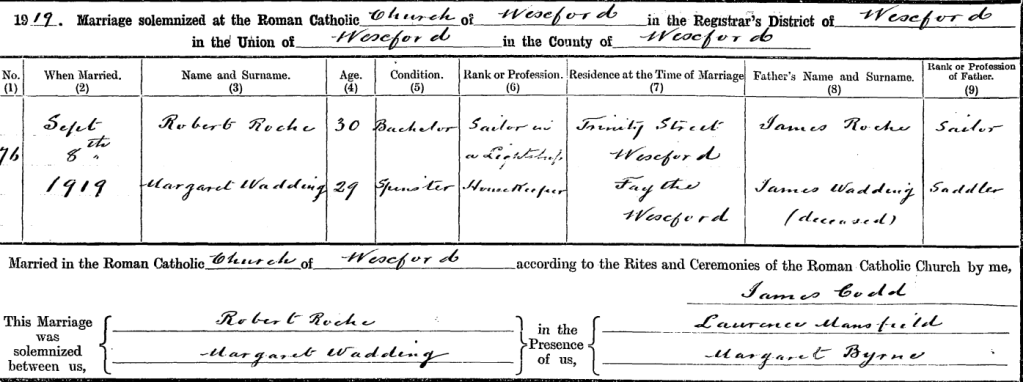 Margaret (Davis) and James WADDEN/WADDING’s fourth daughter Margaret Mary (b. 15 June 1891) married Robert ROCHE, a sailor in a lightship, in Wexford in 1919.