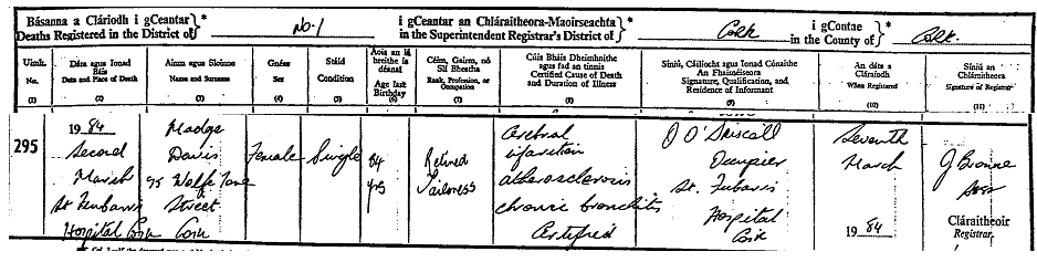 Margaret Francis, known as Madge, born 10 November 1899 on Magazine Rd, Rural No. 2 District, Cork was the seventh child of Mary B. (O’/Callaghan) and George DAVIS and the third to survive infancy.