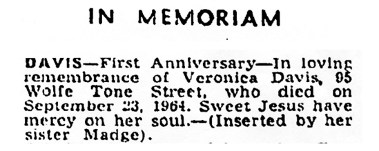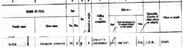 Veronica spent some time in New York. She departed from Cobh on the Cleveland on 23rd April 1928. At the time she was a draper’s assistant, and was recorded as being from the Irish Free State. She arrived 6th May.