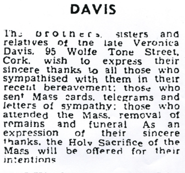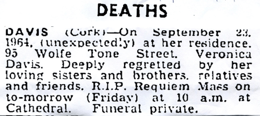 Veronica Frances, known as ‘V’, was born on 23 June 1902 at Magazine Rd., Cork. She was the eighth child of Mary B. (O’/Callaghan) and George DAVIS, and the fourth to survive infancy.
