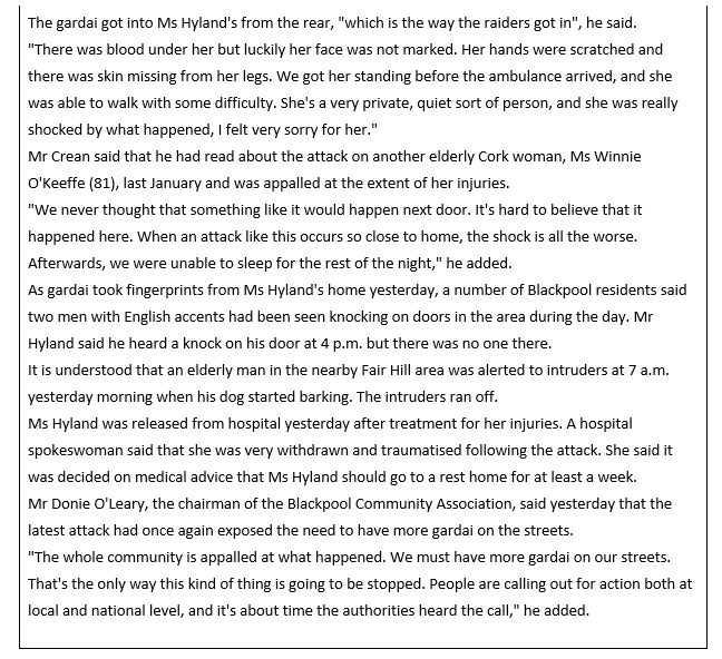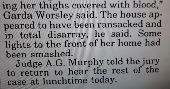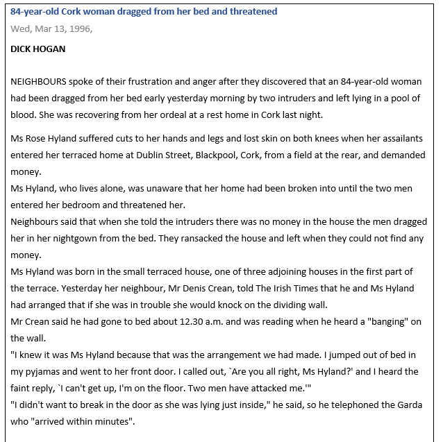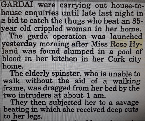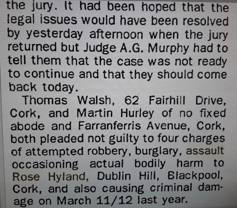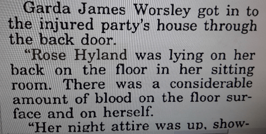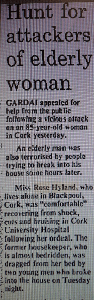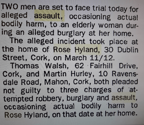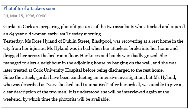 The following from an Irish Examiner article of Thursday 20th November 1997 shows that, while awaiting trial on bail for Rosie’s attack, Martin Hurley (25) had assaulted an elderly man about the head with an iron bar.