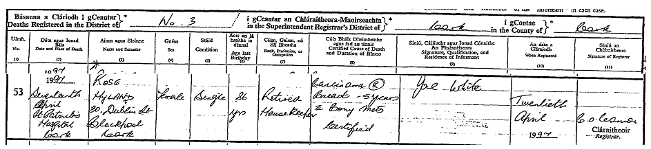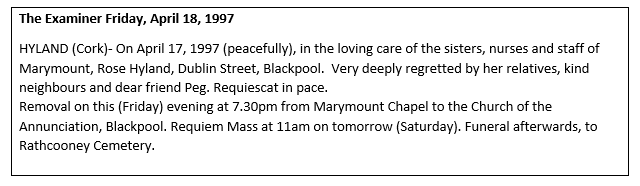 Rosaleen ‘Rosie’ HYLAND died on the 17th April 1997, aged 86 years at St Patrick’s Hospital.