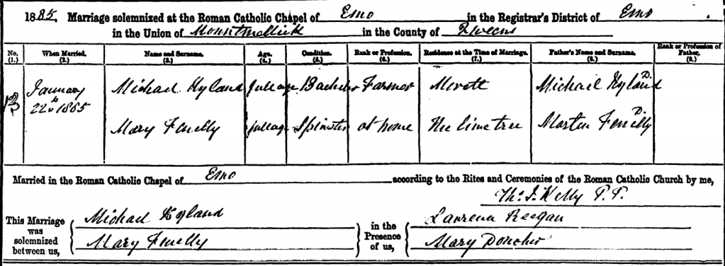 He was one of only two of the Hyland family to marry, the other being my great grandfather Patrick. Michael married Mary FENNELLY at Emo on January 22nd 1885. Interestingly, neither of Michael’s brothers who were still in Morette was his witness.