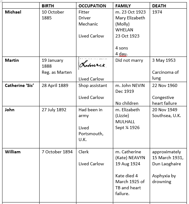 Michael and his family are shown as living in Barrack St., Carlow, in the 1911 census.