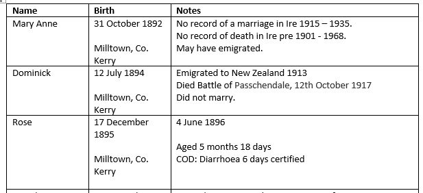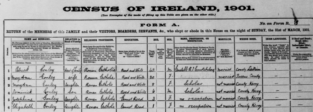 Patrick Gonley was posted to Co. Kerry. He and Mary Ann Dooley had eight children, seven of whom survived childhood: