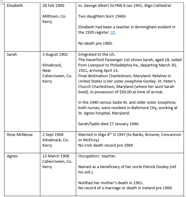It would seem the only descendants in this line are the daughters of Elizabeth (Gonley) GLYNN. I have had conntact with one of these daughters.
